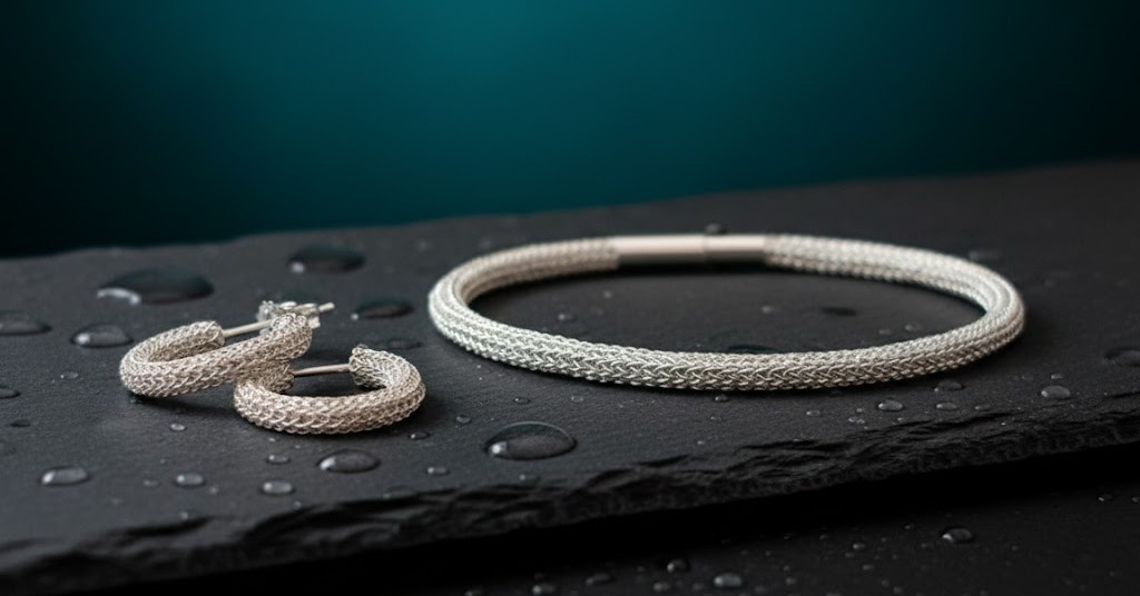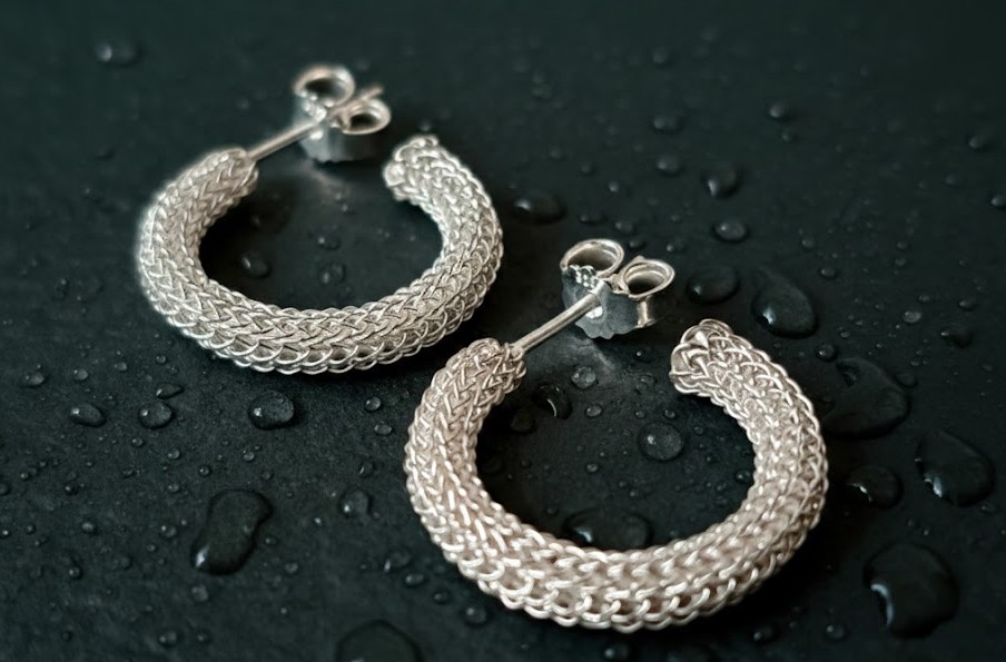 Wikinger-Strickketten in verschiedenen Kombinationen - 925er Silber und Schmuckdraht. Blütenanhänger aus Schmuckkeramik.